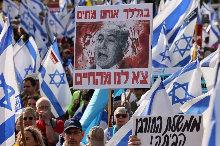 بدأ خصوم نتنياهو في تنفيذ احتجاجات جماهيرية حاشدة، ووجه وزير الدفاع السابق غانتس حديثه لنتنياهو قائلا “إذا واصلت الطريق الذي تسير فيه، فإن مسؤولية الحرب الأهلية التي تتغلغل في المجتمع الإسرائيلي ستلقى على عاتقك”، كما حذر الرئيس هرتسوغ في خطاب متلفز من “أن الحرب الأهلية أمر غير مستبعد”.