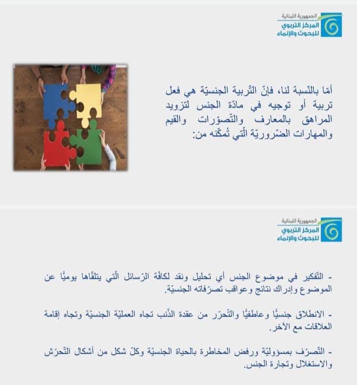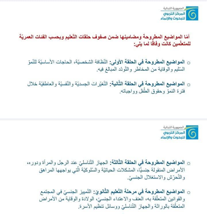 ٣- يضع المركز التربوي للبحوث والإنماء المواضيع المطروحة في حلقات التعليم ، ويخصص المرحلة الثانوية لإدماج موضوع “التمييز الجنسي في المجتمع والقوانين المتعلقة به” (صورة مرفقة )..