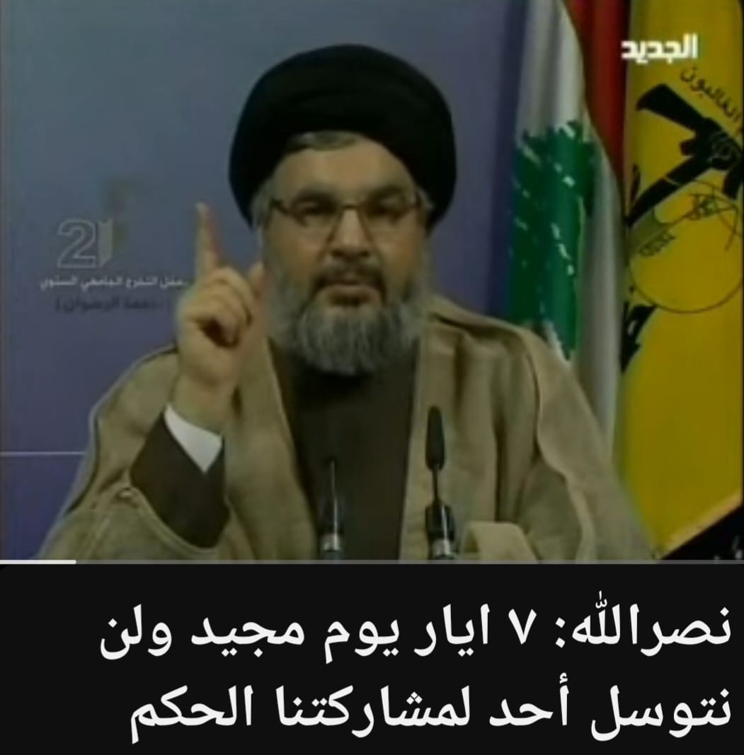 يذكر اللبنانيون إصرار حسن نصرالله على تمجيد السابع من أيار، في انحطاط واضح للفكر السياسي وفي انعكاس لوضاعة هذا المشروع الإجرامي الذي طالما قدّس القتلة وشوّه الشرفاء، وهذه سيرة كل الميليشيات الإيرانية في المنطقة، لكنّ هذا دولنا العربية بدأت تتطهّر من هذا الرجس وقريباً ستزيل آثاره كلها..