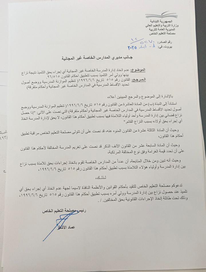 غير أن اللافت أنه بعد هذا المؤتمر والتساؤلات العلنية لدى أولياء الطلاب، عمّمت وزارة التربية في مطلع شهر أيار الحالي مذكرة رسمية موقّعة من رئيس مصلحة التعليم الخاص في وزارة التربية عماد الأشقر، تذكّر فيها المدارس الخاصة بوجوب الالتزام بأحكام القانون 515/96، وتمنع اتخاذ أي إجراء إداري أو تربوي بحق التلميذ في حال وجود نزاع مالي مع ولي أمره، ما لم يصدر قرار صريح من مصلحة التعليم الخاص.
