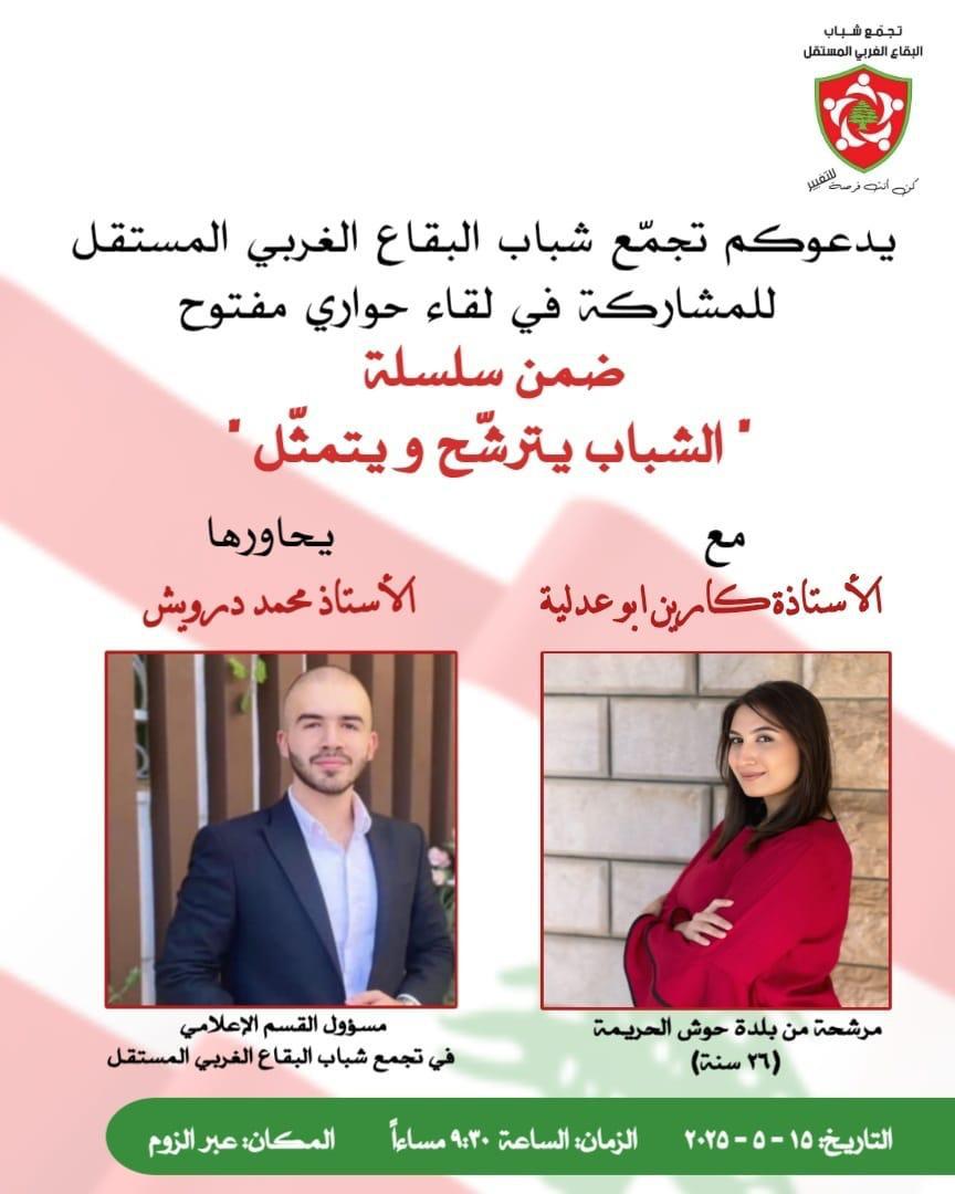 شهد البقاع الغربي على مدى يومي 14 و15 أيار 2025 انطلاق سلسلة ندوات حوارية بعنوان “الشباب يترشّح ويتمثّل!”، نظّمها تجمّع شباب البقاع الغربي المستقل، بمشاركة مرشحين شباب تتراوح أعمارهم بين 24 و35 عامًا من قرى وبلدات متعددة في المنطقة. وتأتي هذه الندوات في إطار مشروع مستمر يهدف إلى تمكين الشباب سياسيًا ومجتمعيًا، وخلق مساحة تفاعلية تُعزز حضورهم في الشأن العام، لاسيما مع اقتراب الاستحقاقات البلدية.