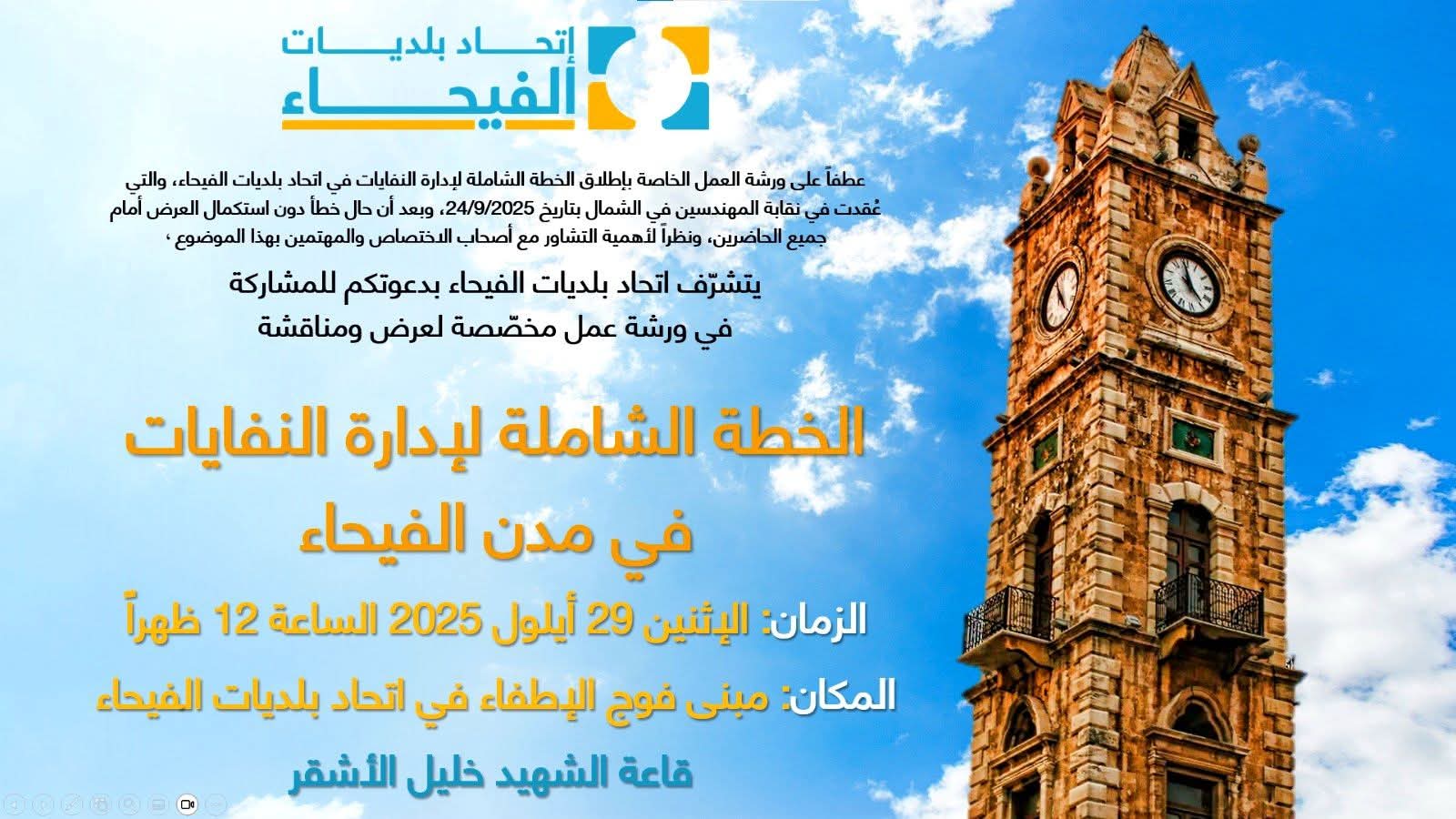 يتشرّف اتحاد بلديات الفيحاء بدعوتكم للمشاركة في ورشة عمل مخصّصة لعرض ومناقشة الخطة الشاملة لإدارة النفايات.
