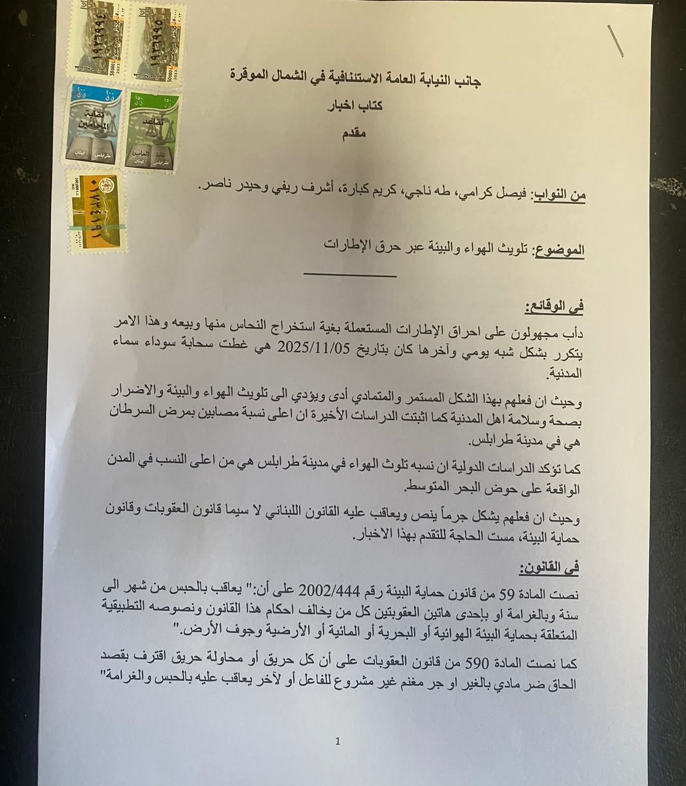 تقدّم نواب طرابلس فيصل كرامي، أشرف ريفي، طه ناجي، كريم كبارة، وحيدر ناصر، صباح اليوم، بإخبار لدى النيابة العامة الاستئنافية في الشمال ضد كل من يُظهره التحقيق متورطًا في تلويث الهواء والبيئة عبر حرق الإطارات. وطالب النواب ب”فتح تحقيق لتحديد هوية الفاعلين وتوقيفهم ومحاسبتهم، ورفع الضرر عن المدينة وأهلها”.