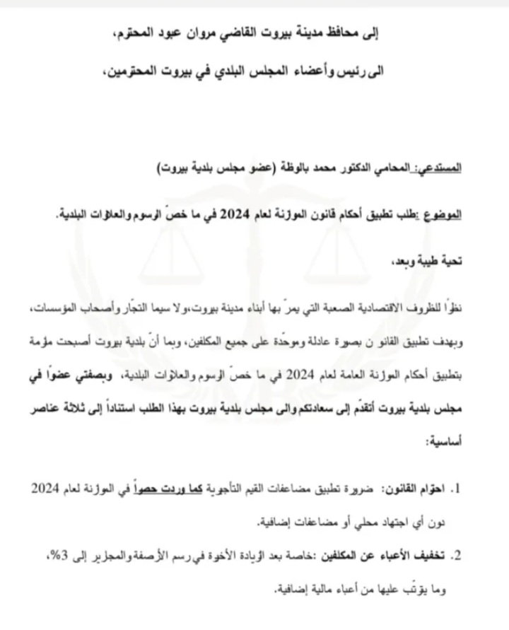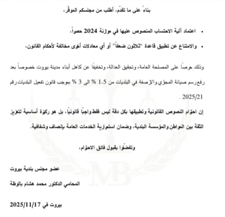 وجّه عضو بلدية بيروت، المحامي محمد بالوظة، كتاباً إلى محافظ بيروت القاضي مروان عبود وإلى أعضاء المجلس البلدي، يطالبهم فيه بتطبيق أحكام قانون الموازنة العامة لعام 2024 المتعلقة بالرسوم والعلاوات البلدية. وأكد بالوظة أنّ القانون يرتكز على ثلاثة عناصر أساسية، داعياً إلى احترام النصوص القانونية وتنفيذها بما يضمن الشفافية والعدالة المالية داخل بلدية بيروت.