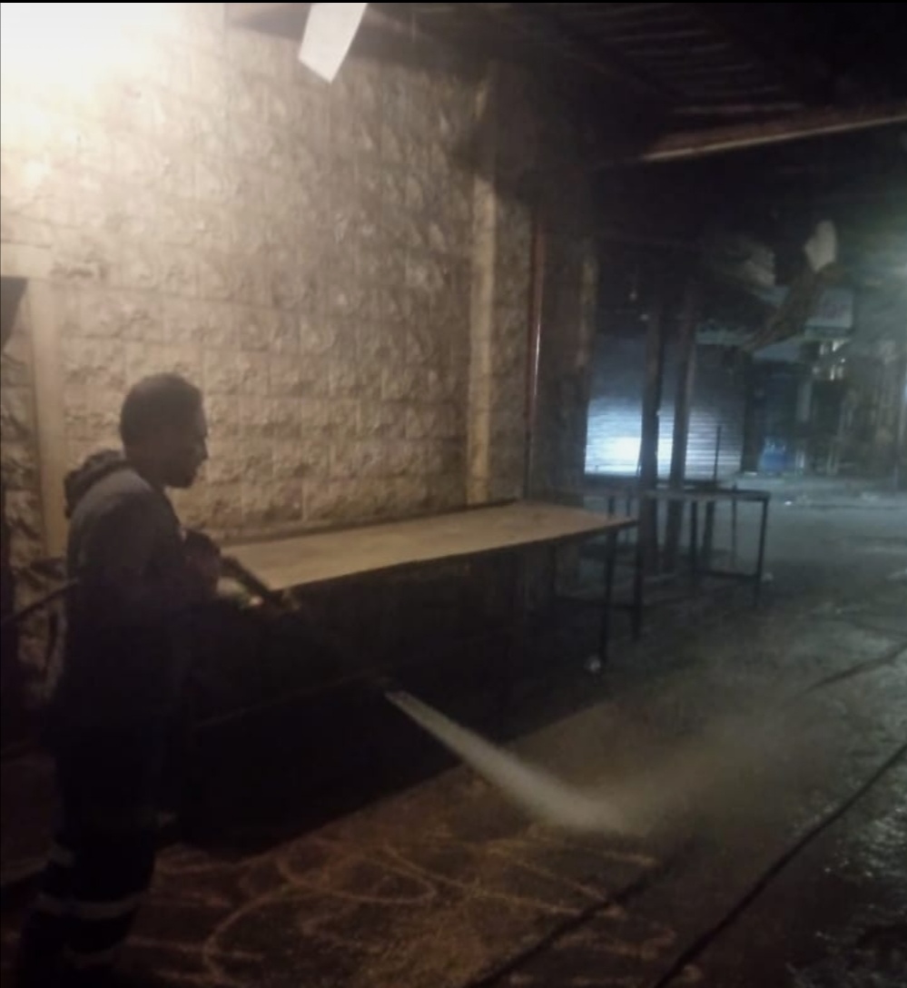 وشملت الحملة أعمال الكنس والشطف لمداخل المحال التجارية ودور العبادة والممرات وتنظيف وتعقيم المستوعبات.