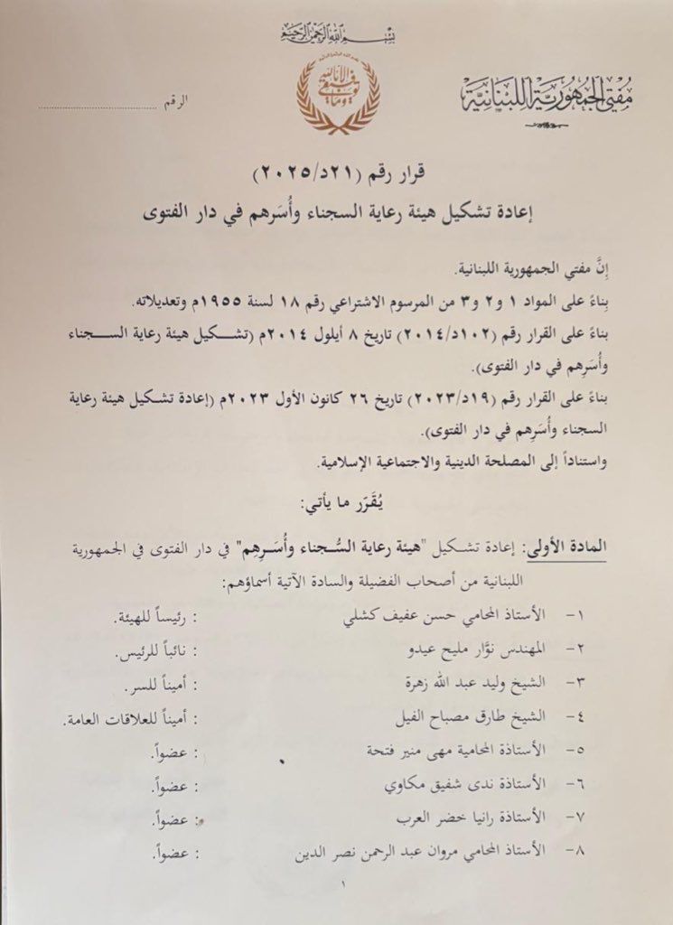 أصدر مفتي الجمهورية اللبنانية الشيخ عبد اللطيف دريان قراراً بتشكيل هيئة رعاية السجناء وأسرهم في دار الفتوى، برئاسة المحامي حسن عفيف كشلي، وعضوية عدد من الشخصيات الدينية والقانونية والاجتماعية.